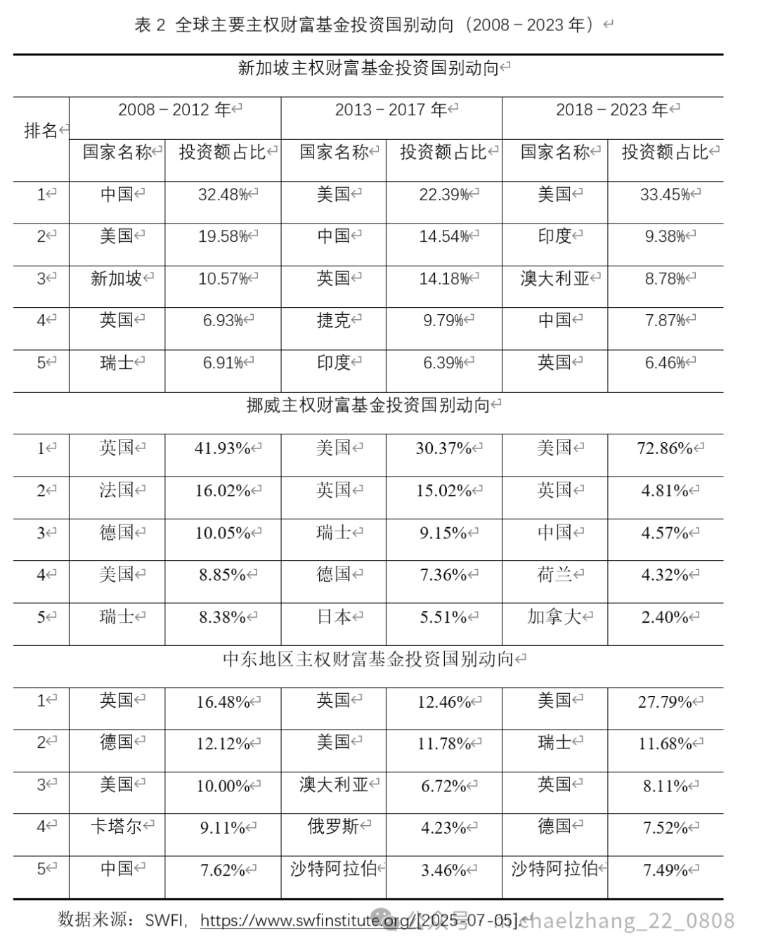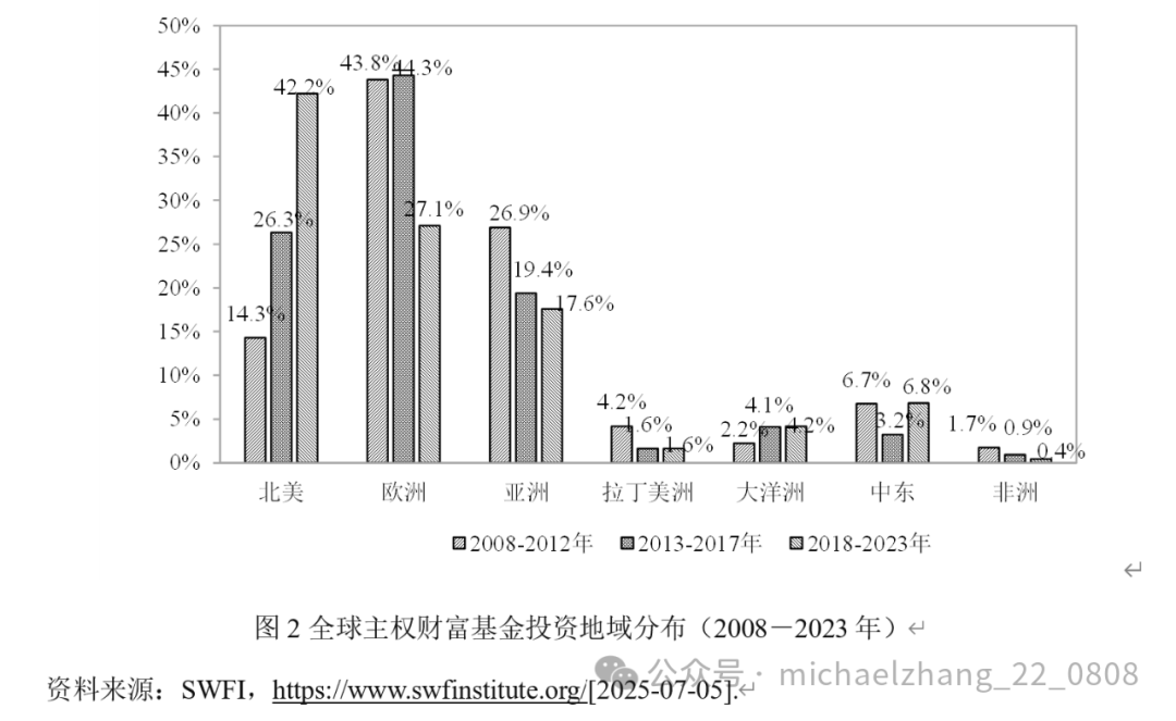 与长期性停滞时期相比,这一时期内全球主权财富基金增加了对股票、债券与房地产的投资,但减少了基础设施投资与另类投资,其中另类投资的下滑较为显著。结合投资地域来看,2018年中美贸易摩擦至今,投资美国的资金明显增加,而投资欧洲、亚洲等地区资金有所下降(见表2)。如2023年挪威的政府全球养老基金(GPFG)显著增加了美国股票的投资权重(达到46%),而相应降低了欧洲和日本股票的持股比例,目前GPFG已经成为全球最大的美国股票投资者之一。