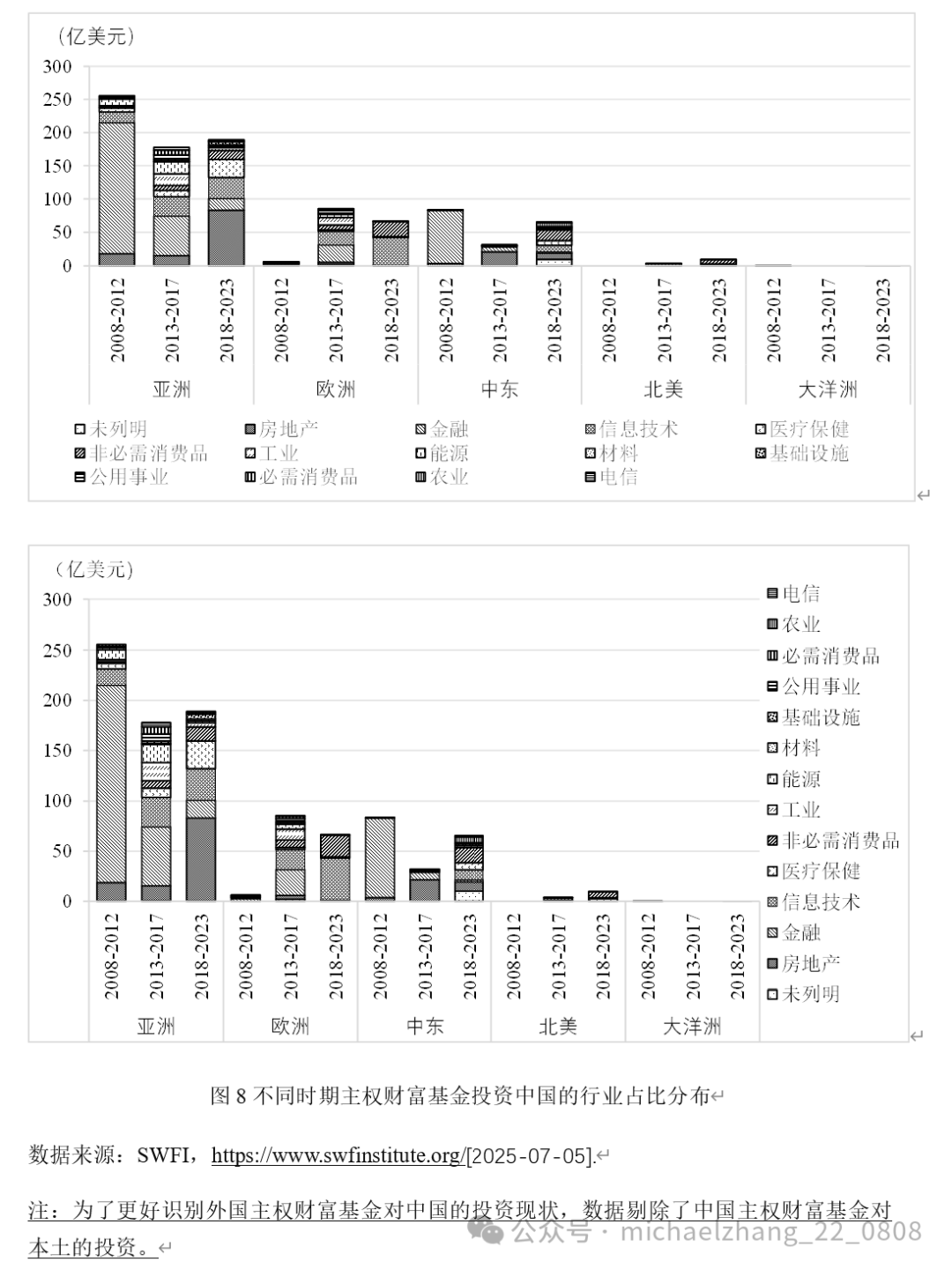 2008-2023年期间全球主权财富基金对中国投资的地域分布中,亚洲地区对中国投资占据绝对比例,投资主要来自于新加坡淡马锡和GIC,此外,马来西亚的主权基金也进行了部分投资;欧洲地区对中国的投资主要来自于挪威GPFG;中东地区对中国的投资主要来自于海湾地区主权基金;北美地区基金从2014年才开始对中国投资;大洋洲地区基金在2013-2017年未对中国投资;非洲和拉丁美洲地区基金未对中国投资(见图7)。由此可见,主权财富基金对中国的投资来源是非常集中的。2018-2023年,相对于欧洲地区和亚洲地区投资占比呈现下降趋势,中东地区主权财富基金对中国的投资占比明显增加,中东地区基金是未来值得重点关注的投资来源主体。