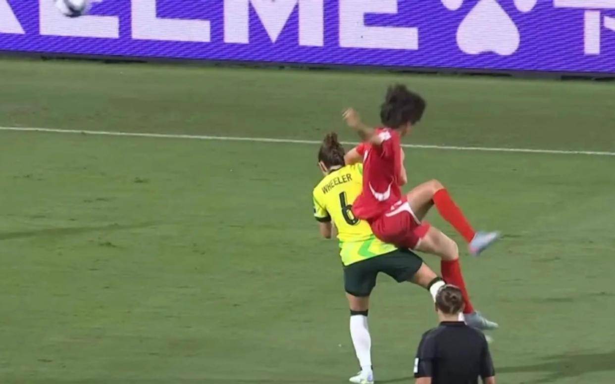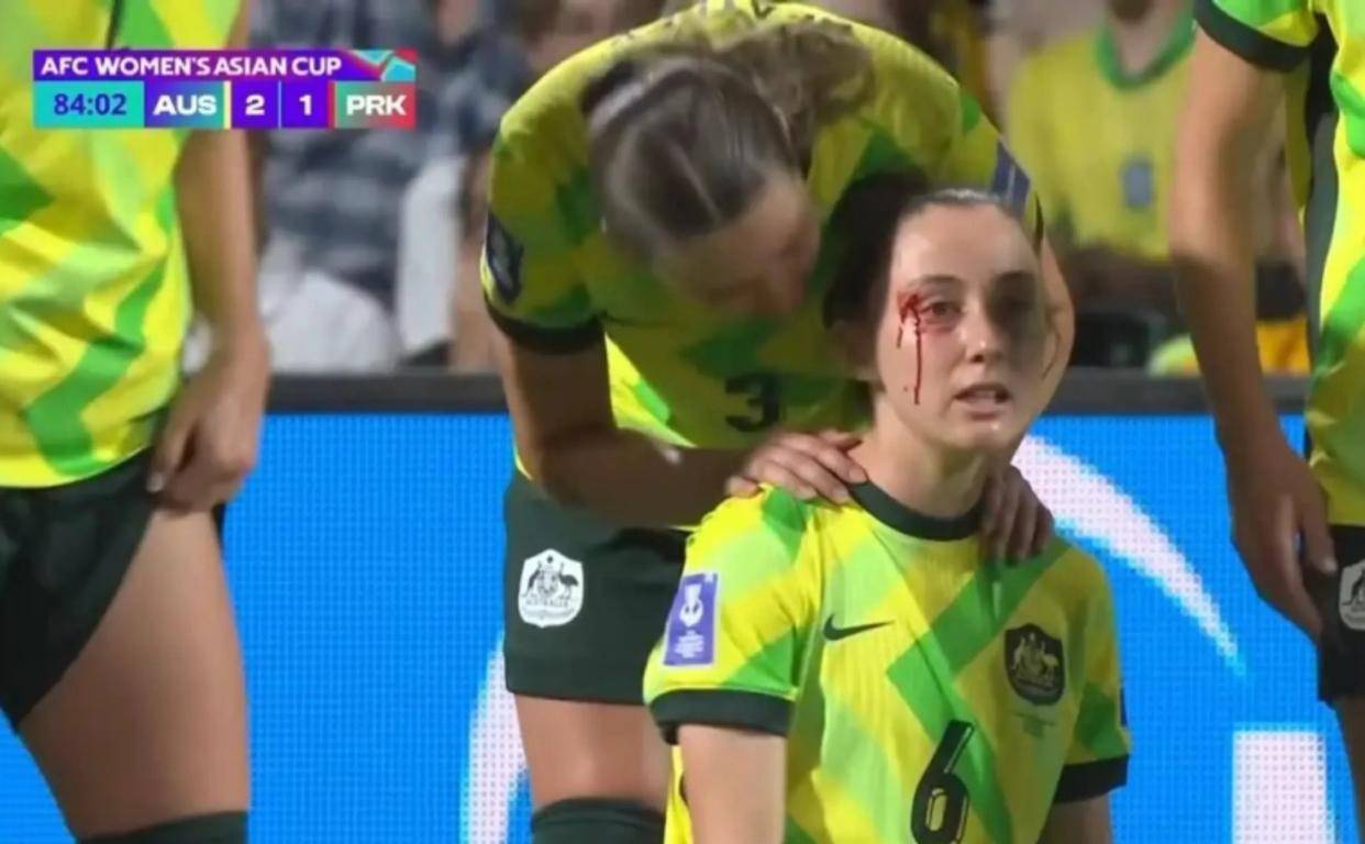 在四分之一决赛中,朝鲜女足迎战东道主澳大利亚队。在这场比赛中,朝鲜队在数据上占据了压倒性的优势,控球率超过60%,全场狂轰23脚射门,而澳大利亚仅有4次。然而,朝鲜队再次为自己的防守失误和争议动作付出了代价。比赛进行到第84分钟,几乎与对阵中国队时相同的时间点,争议再次上演。朝鲜队员明友成在争顶高空球时,下落过程中用手肘结结实实地砸在了澳大利亚球员惠勒的头部太阳穴附近。惠勒当场眉骨开裂,鲜血直流,队医紧急入场进行处理。澳大利亚全队情绪激动,围住裁判投诉这是一个红牌动作。然而,当值主裁判在观看回放后,依然只向明友成出示了一张黄牌。赛后,日本网友在评论中也特别提到了这一幕,批评该球员在吃到黄牌后还摊开双手,摆出一副“凭什么”的无辜态度,完全没有反省之意。